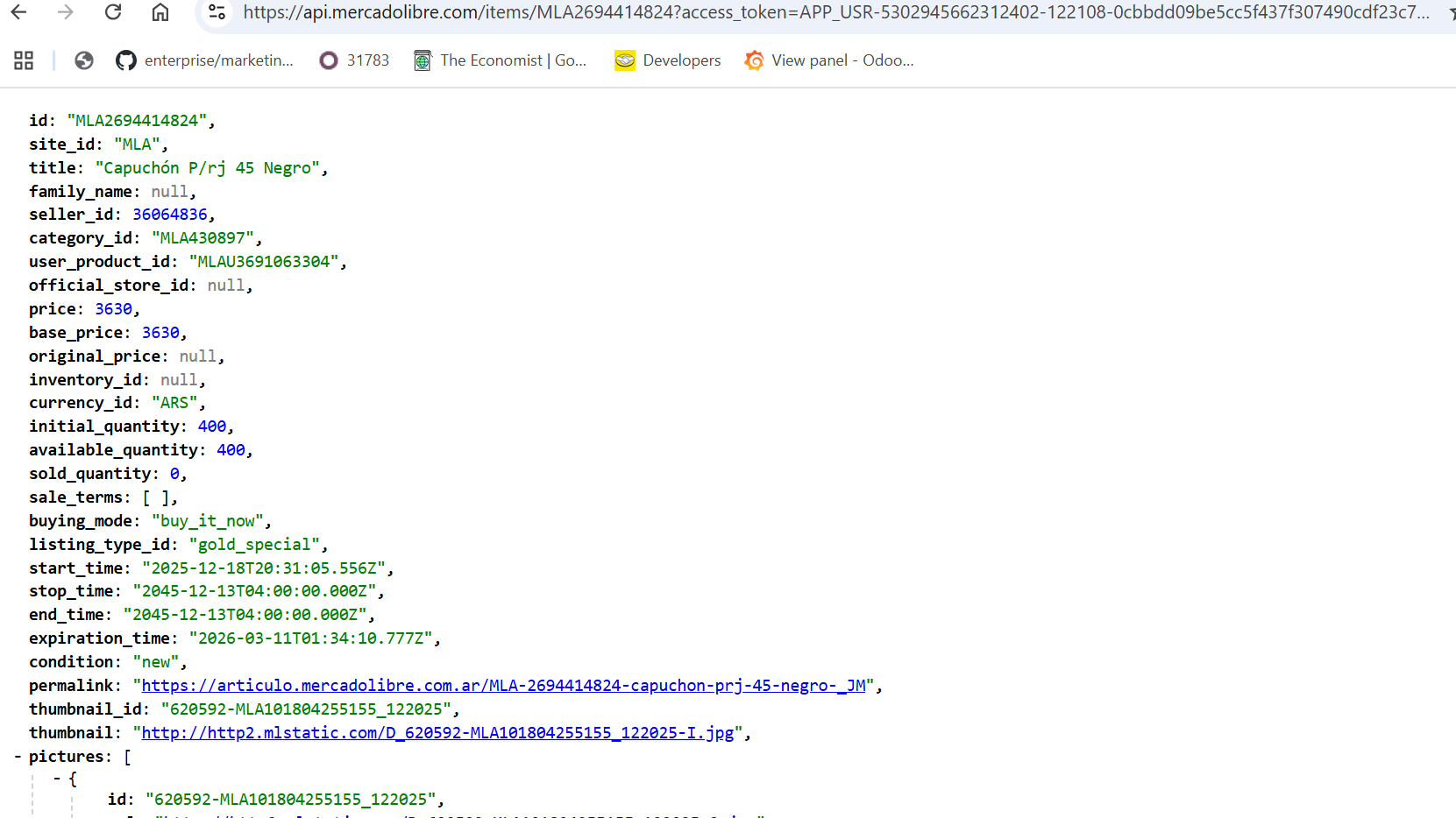 Bien, como se usa el navegador para consultar el API de Mercadolibre? Primero necesitamos conocer el access token (el cual lo brinda generalmente un modulo que conecta Odoo con Mercadolibre, en otro post hablaremos de eso). Y conocer algunos endpoints de Mercadolibre.