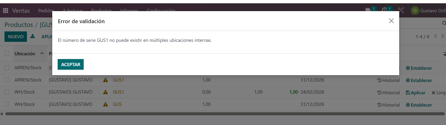 La solución es muy parecida a la que se aplica cuando uno busca prevenir el stock negativo, se hace el control en el momento de crear el quant. En este caso, si el quant tiene un número de serie y este número de serie es realmente un número de serie (no sea cosa que hagamos el control con los lotes), chequeamos que solo exista un quant para una ubicación interna (que es donde se almacena fisicamente el stock). Si hay más de una ubicación interna, se emite un mensaje de error: